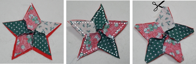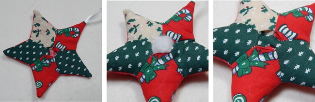 • Stitch the next pieces of patchwork to the previous one in the same manner. When all five pieces have been sewn together, attach the last one to the first one, creating the star shape. There will be a hole in the center from the gaps you left when stitching each piece together. This is important as it will be where you stuff the star later on.