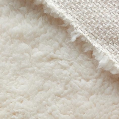 Sherpa, or Sherpa Fleece was created to mimic the look of actual sheep fleece. It is often white or ivory, but can also come dyed. It is characterized by thick bunched fibers that can be quite long... but only on one side. The back side of the fabric is not brushed or raised, and in some cases it has even been bonded with a suede or leather-like material. While some thinner non-bonded varieties may have some stretch, it is unlikely to be enough to work well with most fleece patterns.